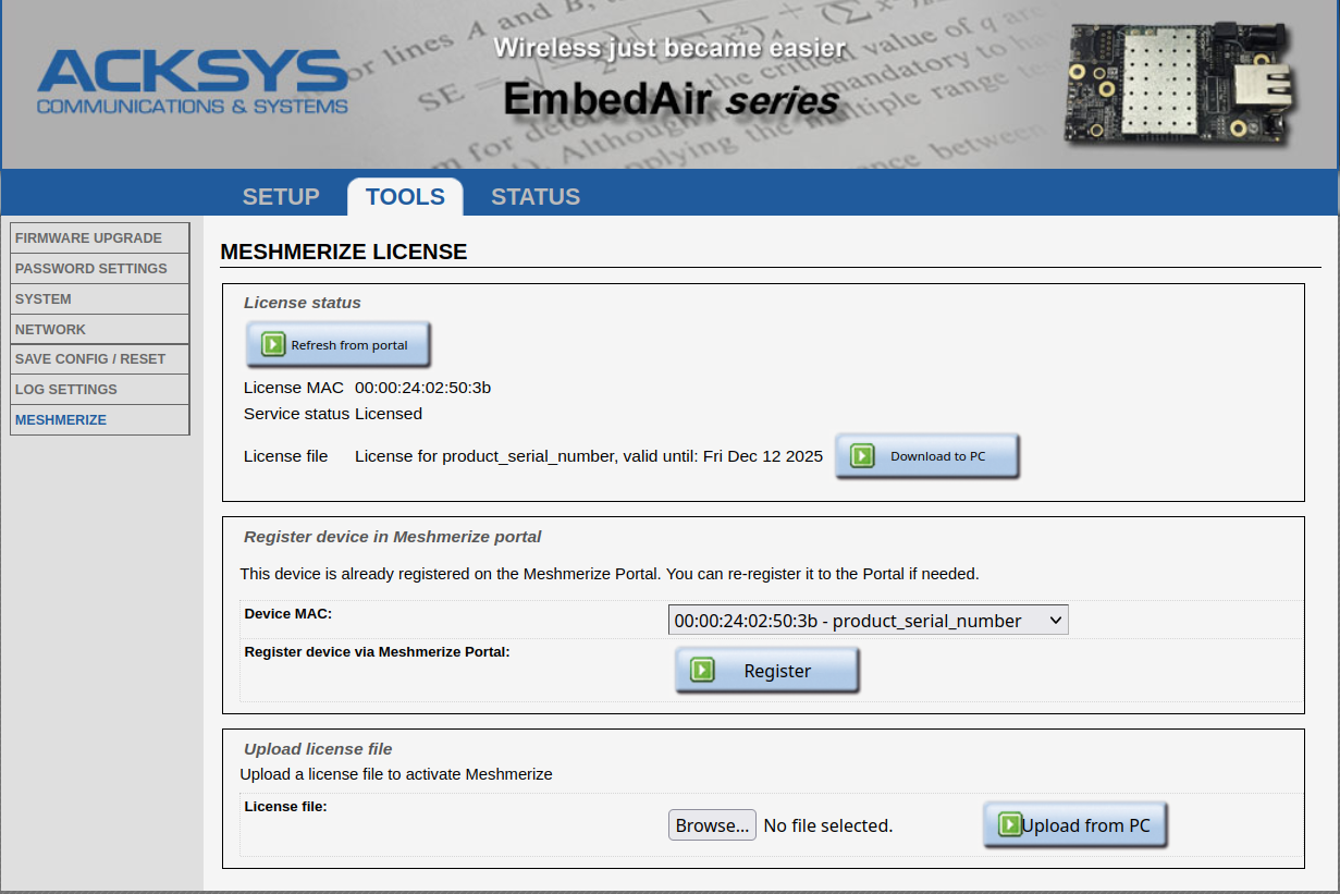 The Service status should indicate if your device is licensed or not. The image below illustrates what it looks like when your device has a valid Meshmerize license installed.