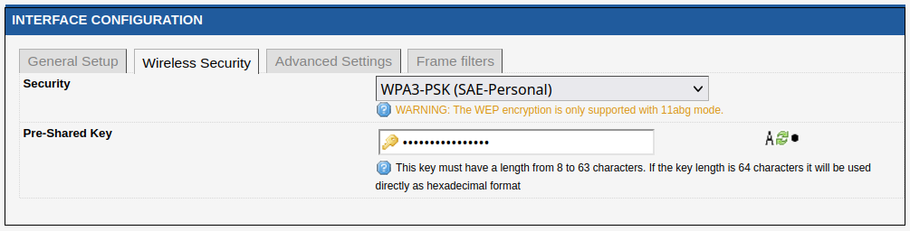 To enable encryption go to the ‘Wireless Security’ tab and select SAE-Personal and enter a passphrase as shown below. Same as the Mesh ID, the passphrase needs to be identical for all devices inside the mesh.