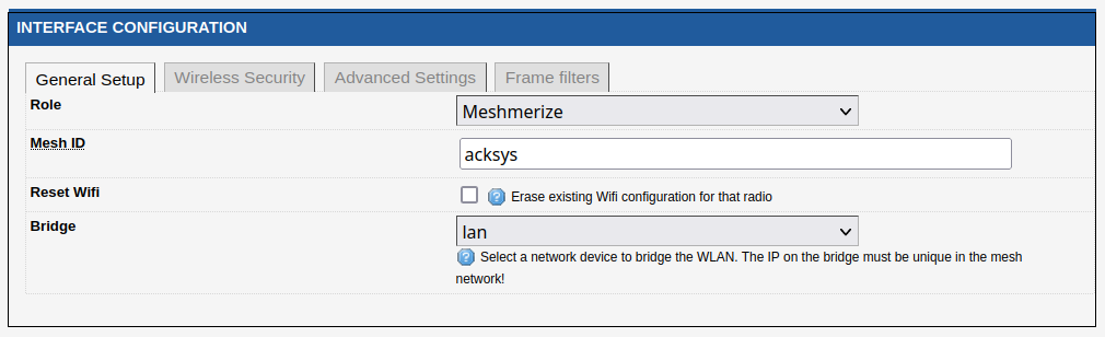 Please enter a Mesh ID, for example ‘acksys' as shown below. The Mesh ID same as a SSID needs to be the same for all devices inside one mesh network.