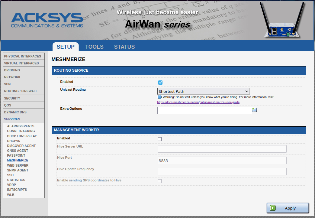 Meshmerize offers several settings to optimize your mesh network's performance. The best configuration may vary based on your specific network needs. To change the current configuration to better suit your network’s requirements navigate to SETUP>SERVICES> MESHMERIZE.