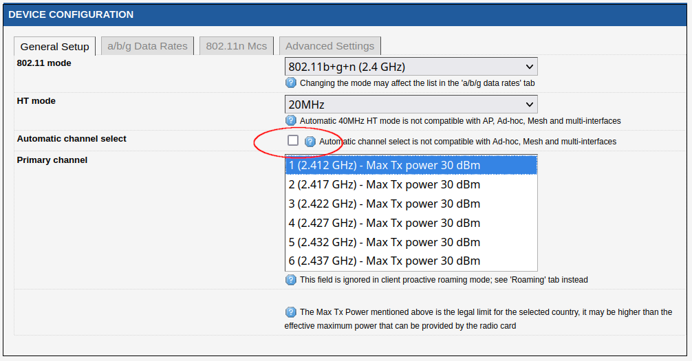 In “DEVICE CONFIGURATION”, please disable "Automatic channel select," and choose a "Primary channel", as shown on the image below.