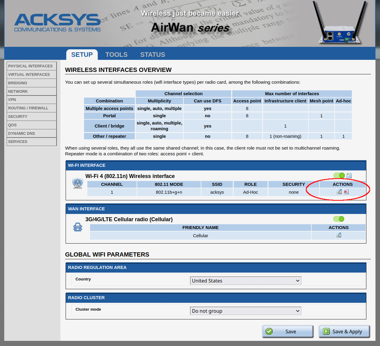 If you want to edit the existing Wi-Fi interface, click on the circled edit icon under “ACTIONS''. If you want to create a new Wi-Fi interface, click on the plus-page symbol above ”ACTIONS".
