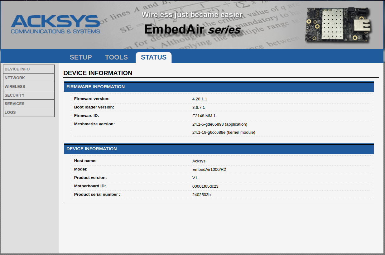 The GUI will ask for a password. If you have not set a password yet, click on “Login” and you will be prompted to set a password. After a successful login, you are directed to the GUI's STATUS page as shown in the image below.