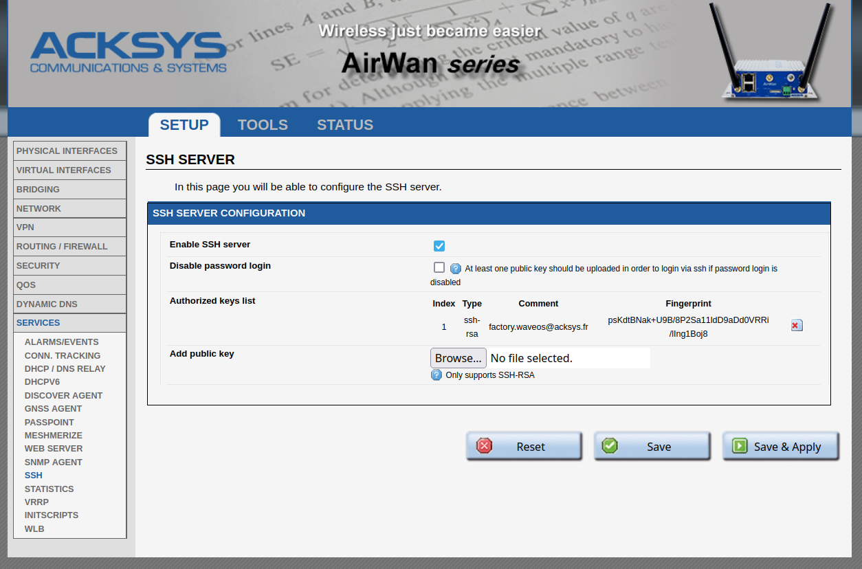 To enable the SSH service go to "SETUP" -> "SERVICES" -> "SSH" and check “Enable SSH server” as displayed in the image below. Please note that the "Disable password login" needs to be unchecked, to access the device without a SSH key.