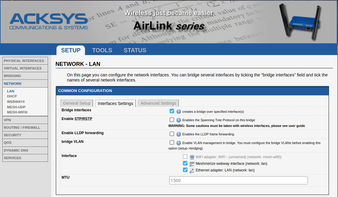 One potential reason for a ping not coming through is that the Meshmerize webway interface might not be included in the LAN network bridge. To confirm that this is not the issue, navigate to “SETUP” → “NETWORK” and select the “LAN” interface. If configured correctly, it should look like the image below, the checkbox under “Interface” is checked for “Meshmerize webway interface”.