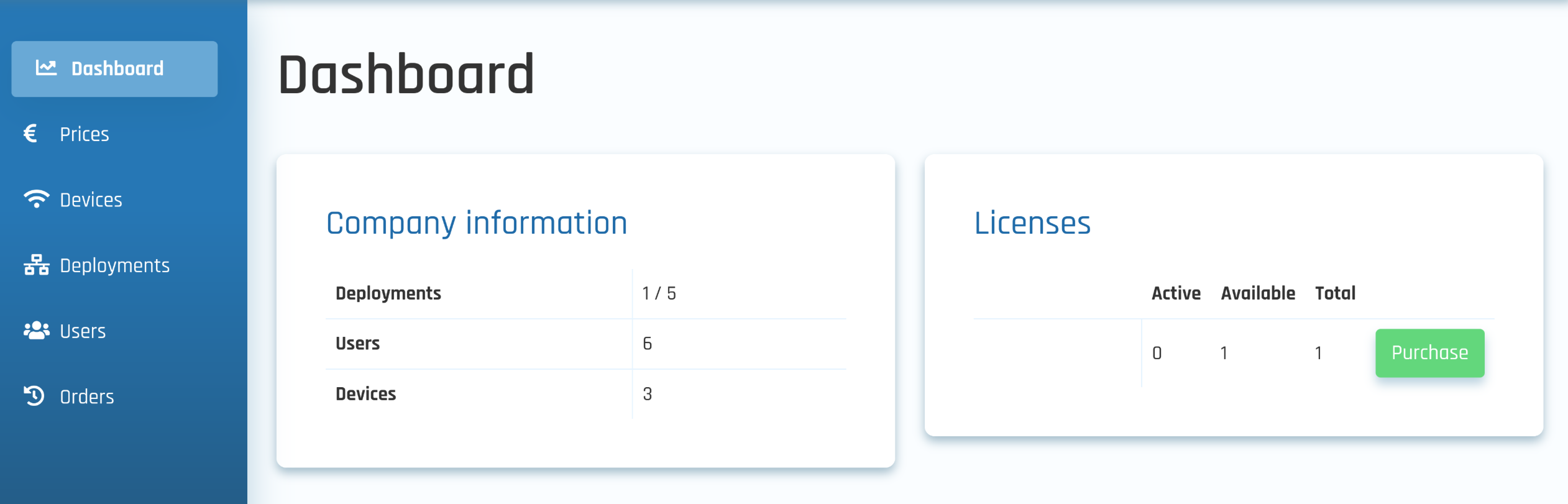 Purchasing licenses can be started through the Dashboard or the Prices page by clicking on Purchase for the licensing prices are enabled for your company.