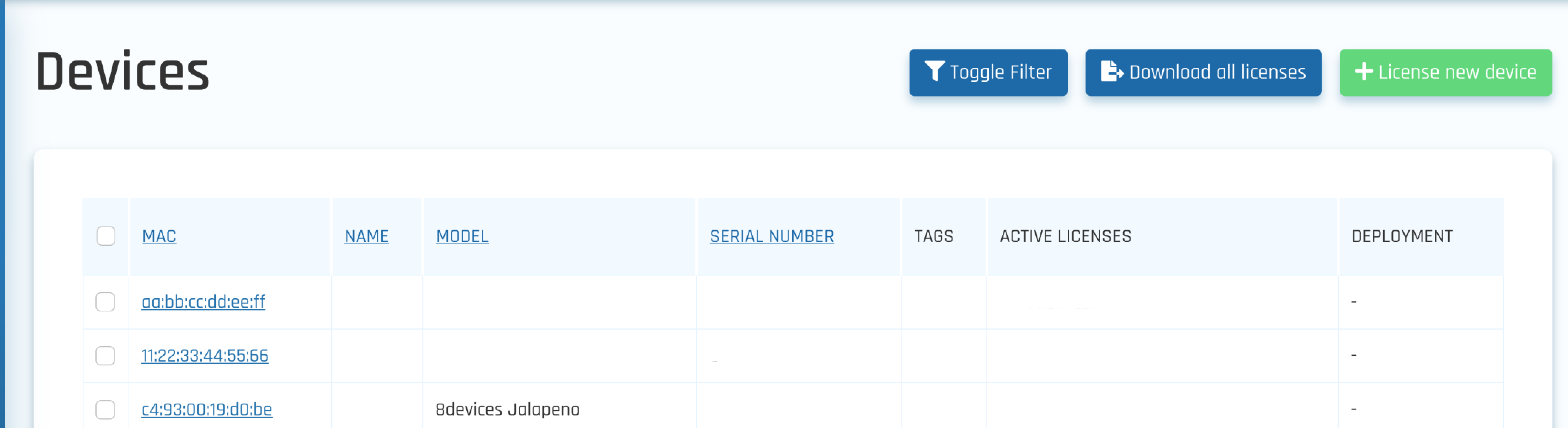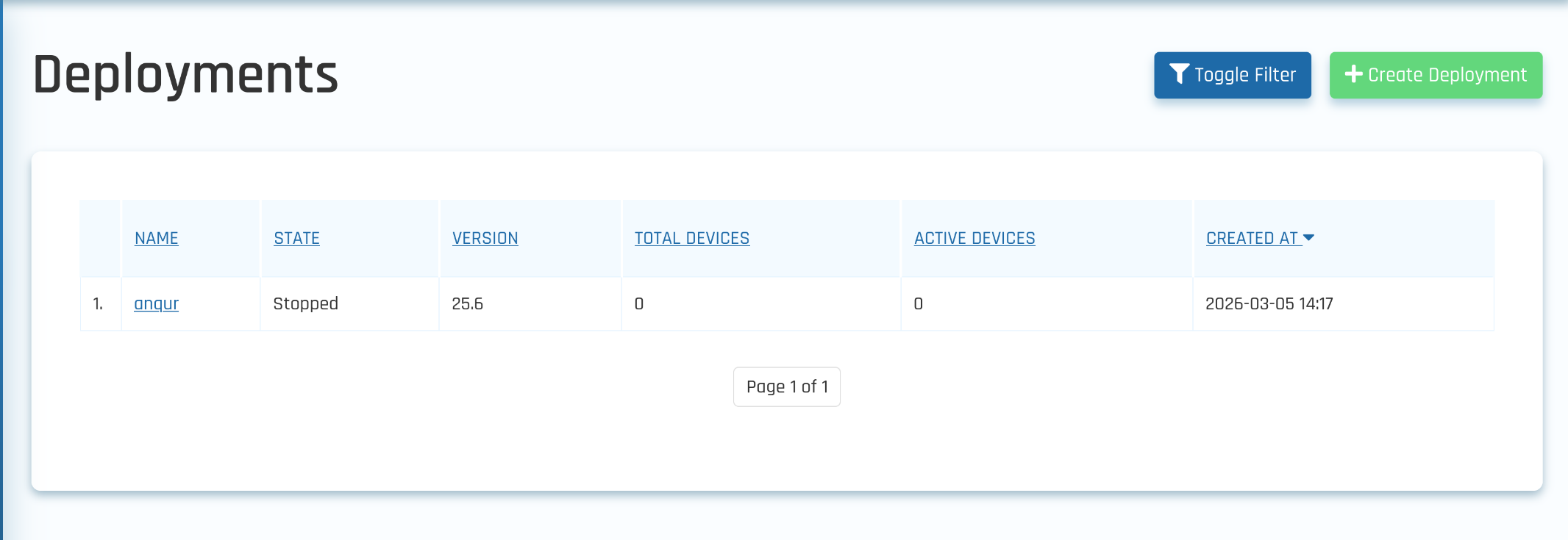 The Deployments page lists all deployments and shows key details including the deployment name, license type, current status (Created, Running, Exited, or Error), version, total registered devices under a specific deployment, active devices (updated every minute), and creation date.