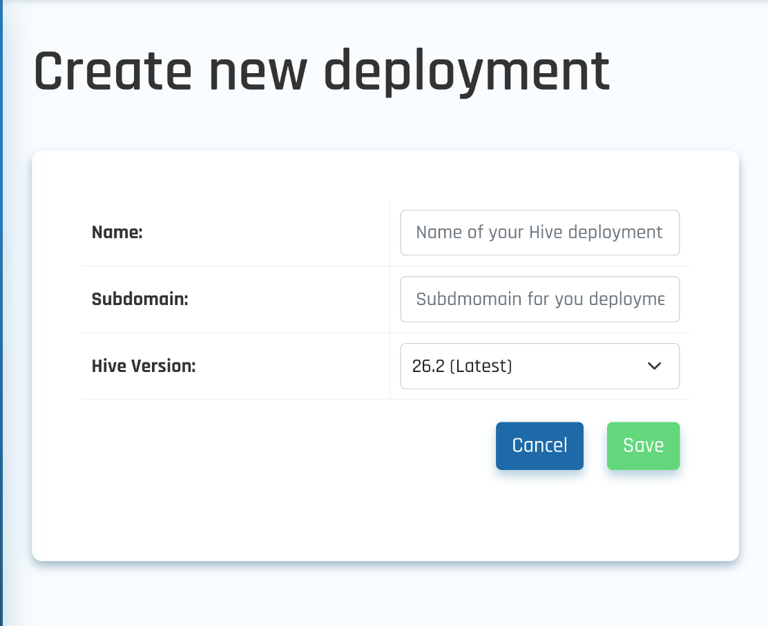To set up a new deployment, click Create Deployment, then enter a Name (used to identify the deployment in the portal and Hive interface), define a unique Subdomain (part of the deployment URL), select the Hive Version, and click Save to create the deployment.