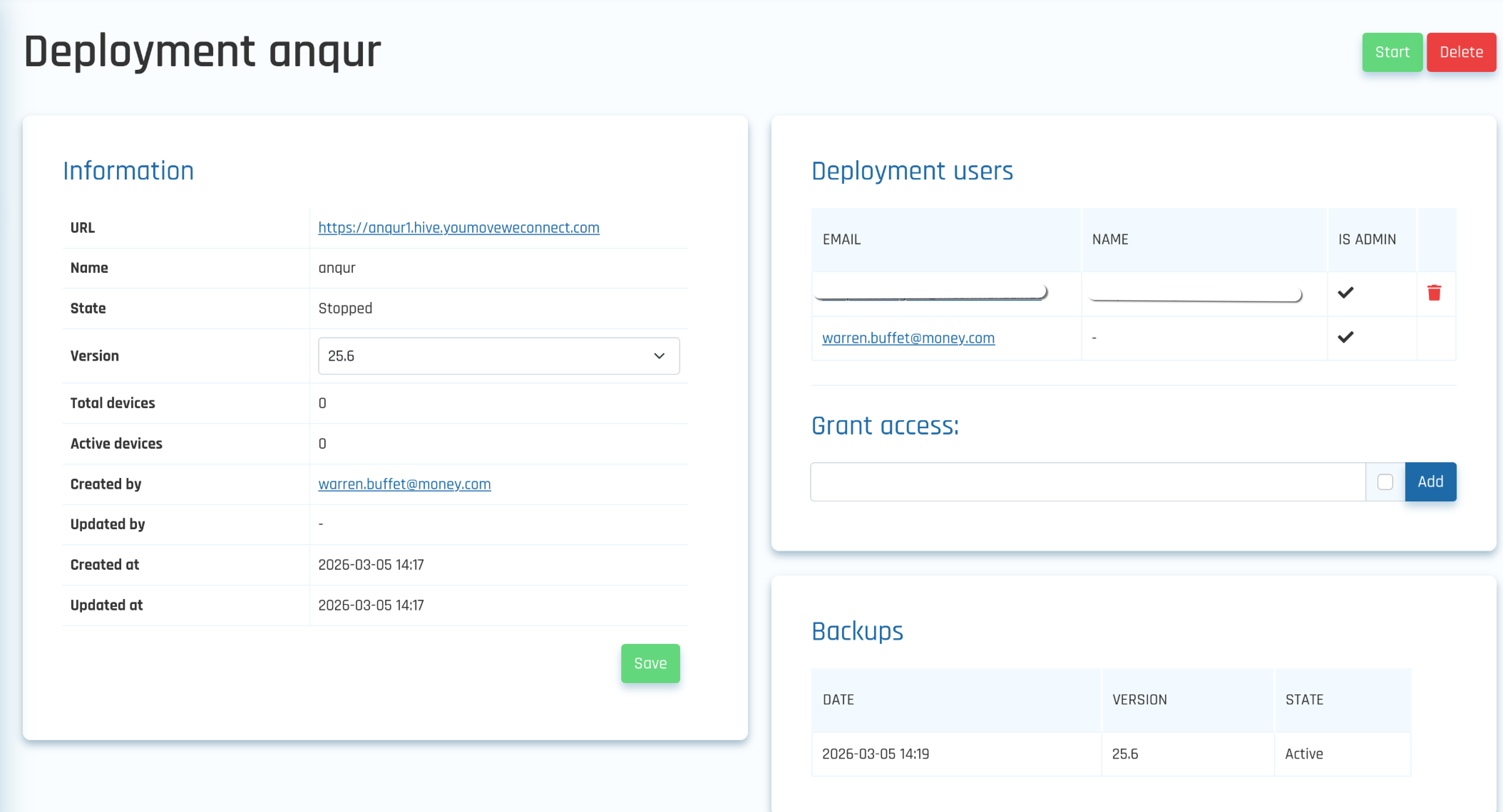 The Deployment view page displays detailed information about the selected deployment, including its status, version, device counts, and backups. From this page, users can Start or Delete the deployment. Additionally, Grant access section is used to grant access to other users for the specific deployment.