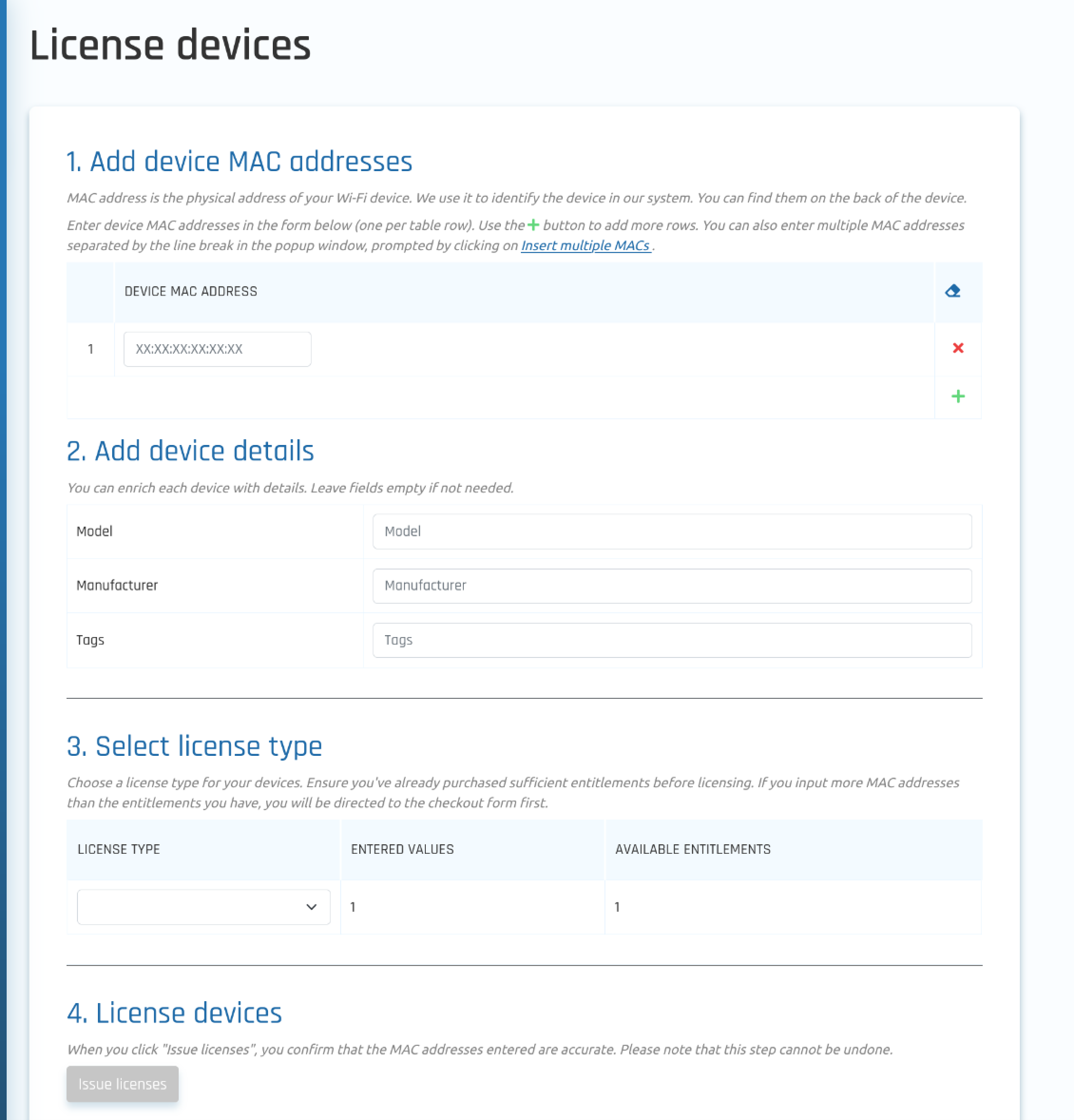 The Device Form is designed to facilitate the conversion of purchased volumes into corresponding licenses. The form includes: