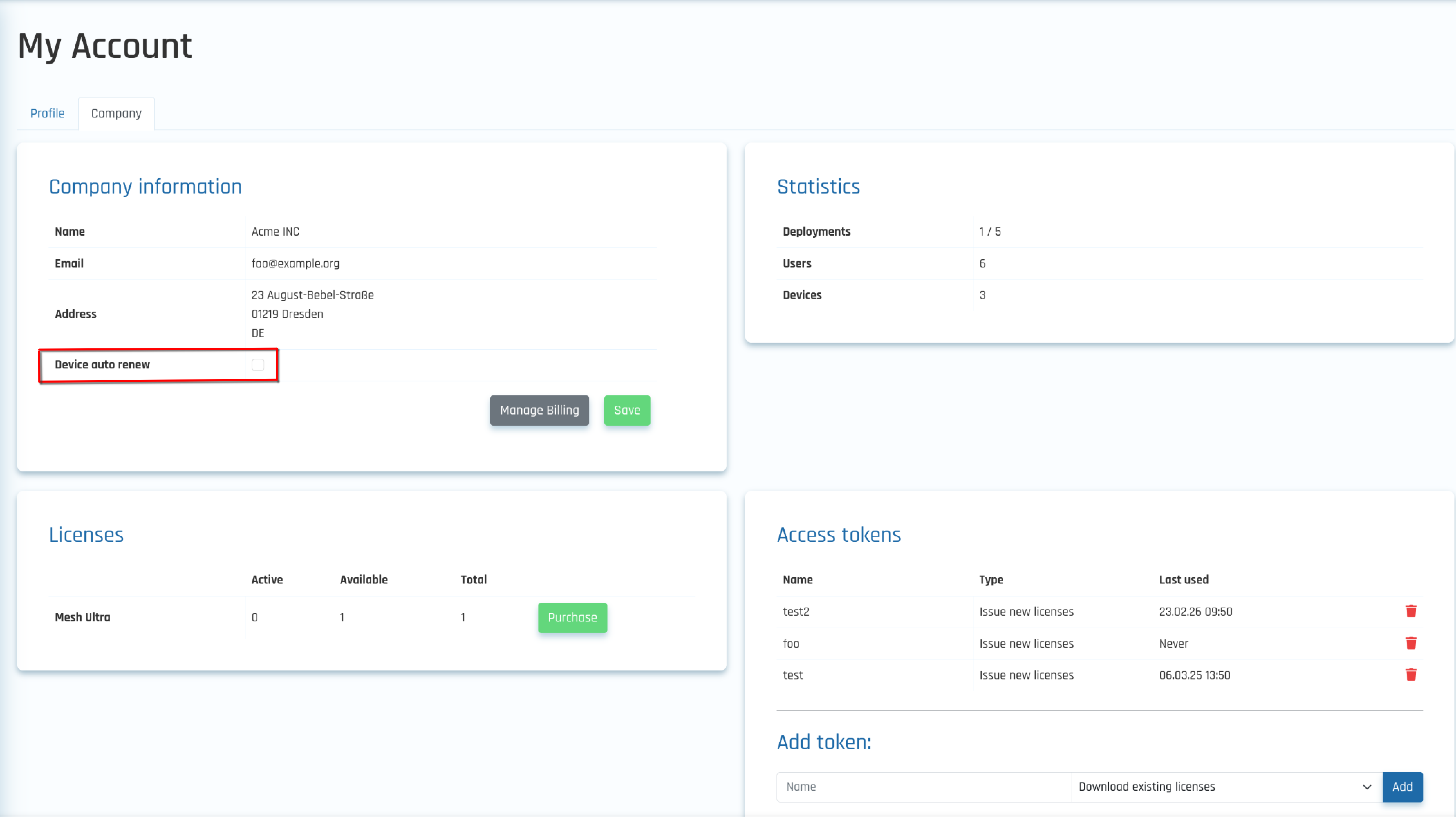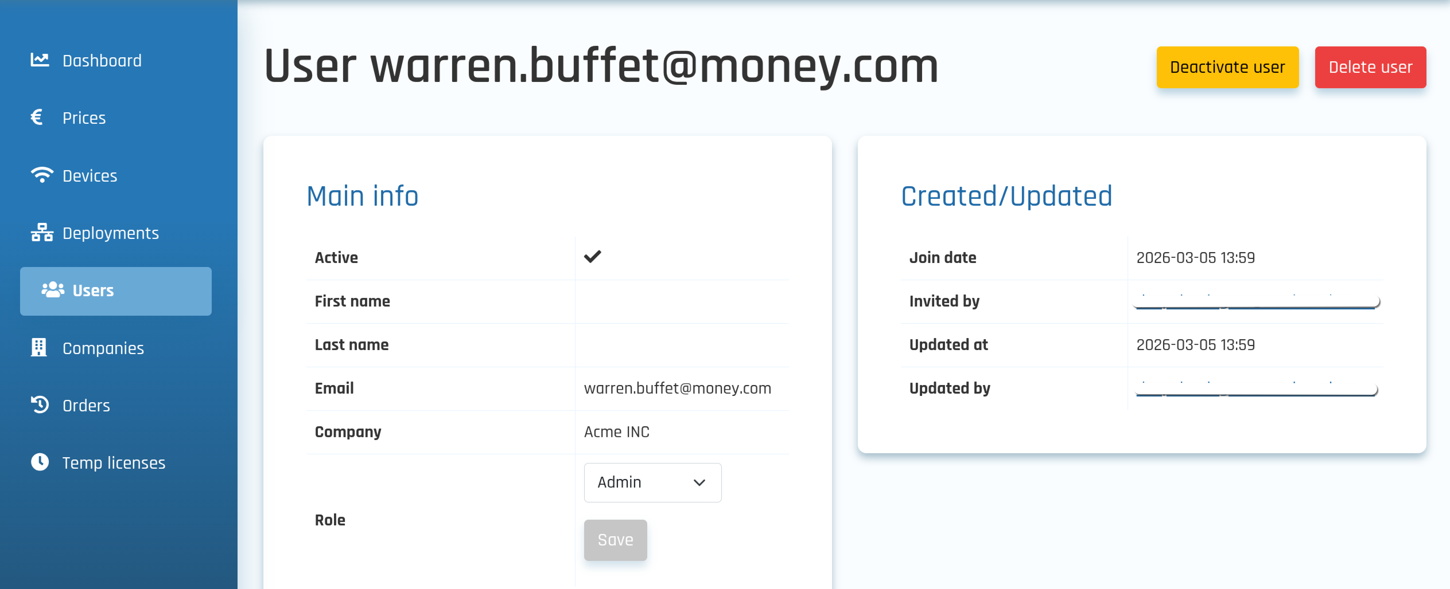 Note: While the majority of account and company fields are editable, constraints apply to account deletions, especially concerning the Last Admin. The Last Admin refers to the final remaining administrator for a company. This admin cannot be deleted to avoid unintentional deletion of company details and associated licenses. To fully remove an account with its company details, the user must contact us directly.