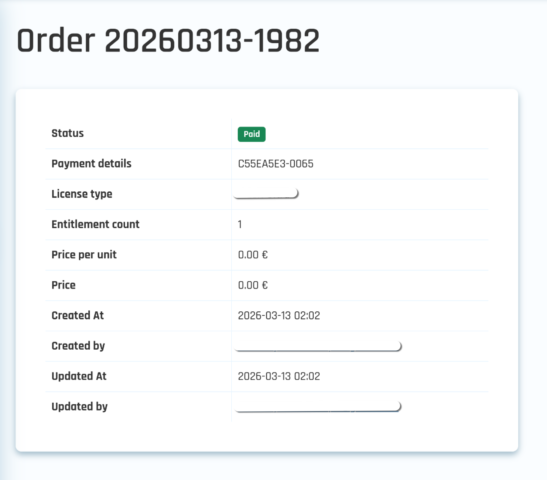 Order details page additionally shows key details such as entitlement count.