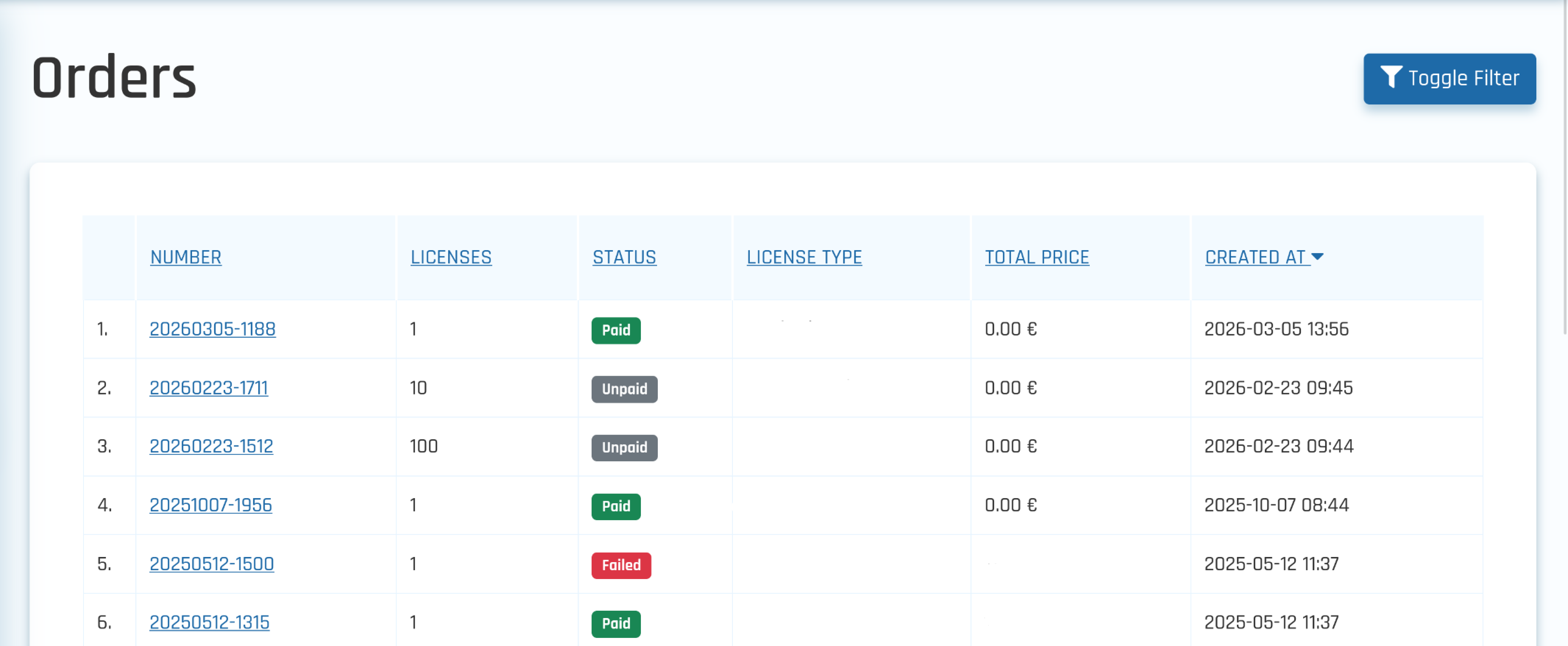 The Orders page lists all orders with details such as order number, license type, price, and status (New, Paid, Unpaid or Failed), and allows users to filter, sort, and navigate through pages for easier order management.