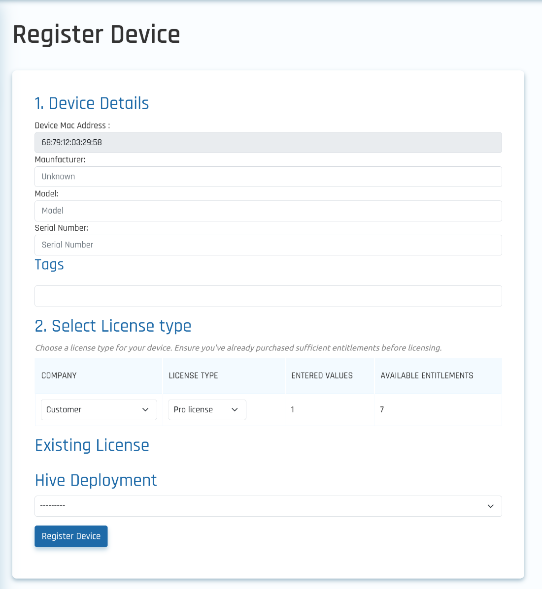 The Device MAC Address is automatically pre-filled. You can optionally enter tags to help identify the device more easily. Under Select License Type, you will see the available license type options and the number of entitlements you have already purchased. Choose the correct license type for the device and click Register Device.